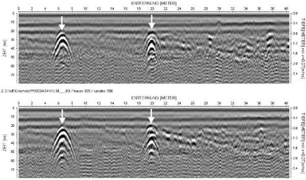 Esas ondas penetran y se propagan por el subsuelo, al encontrar discontinuidades en las propiedades electromagnéticas del medio, (conductividad, permitividad eléctrica y permeabilidad magnética) obtenemos unas imágenes (radargramas) generadas a partir de las reflexiones que el geo-radar recibe, con las que podemos determinar el espesor de los estratos que forman el subsuelo y la presencia de materiales de naturaleza artificial (tuberías, canalizaciones, arquetas, etc) en un rango que va desde los pocos centímetros hasta los 30 metros, dependiendo del tipo de antena utilizada.